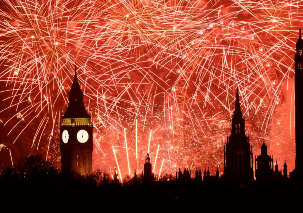 London’s New Year’s Eve celebration along the River Thames remains one of Europe’s most iconic events. Big Ben’s chimes usher in 2026 as fireworks illuminate the London Eye and skyline, symbolizing continuity and renewal.